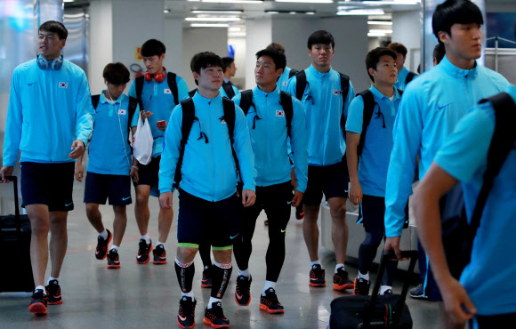 리우올림픽 한국 축구대표팀 선수들이 8일(현지시간) 오후 브라질 브라질리아 국제공항 국내선 터미널에 도착해 공항을 빠져 나가고 있다. 브라질리아에서 한국 대표팀은 8강 진출을 결정할 멕시코와의 조별리그 3차전 경기를 갖게 된다. 2016.8.9 연합뉴스
