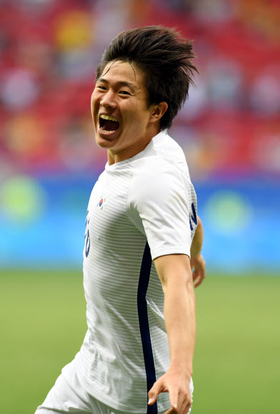 ‘신태용호’의 해결사 권창훈이 10일 오후(현지시간) 브라질 브라질리아 마네 가힌샤 주경기장에서 열린 리우올림픽 남자 축구 멕시코와의 조별리그 C조 마지막 경기에서 후반 32분 천금 같은 결승골을 넣은 뒤 환호하고 있다.
