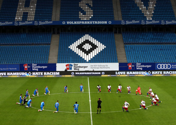 9일 새벽 독일 함부르크에서 열린 분데스리가2 경기에서 이재성이 뛰고 있는 홀슈타인 킬과 홈팀 함부르크 선수들이 경기 시작 전 센터 서클에 모여 한쪽 무릎을 꿇은 채 인종차별에 반대하는 뜻을 담은 퍼포먼스를 하고 있다.