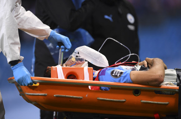 잉글랜드 프로축구 맨체스터 시티의 수비수 에릭 가르시아가 18일 아스널과의 프리미어리그 경기에서 같은 팀 골키퍼 에데르송과 심하게 충돌한 뒤 들것에 실려 그라운드를 떠나고 있다. AP 연합뉴스