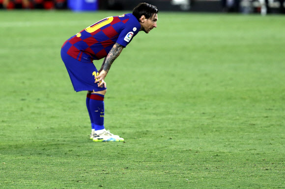 스페인 프로축구 FC바르셀로나의 리오넬 메시가 20일 새벽 열린 세비야FC와의 라리가 경기 도중 경기가 잘 풀리지 않는 것 같은 모습을 하고 있다. AP 연합뉴스