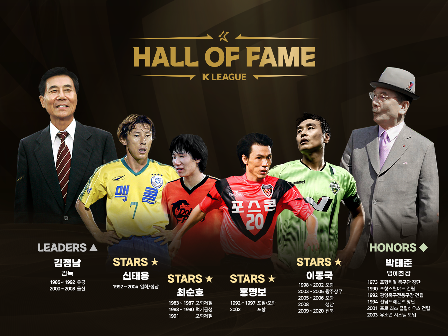선정위원회가 별도로 뽑은 지도자와 공헌자 부문 헌액자로는 각각 김정남 감독과 고 박태준 포스코 명예회장이 선정됐다. 1989년 유공, 2005년 울산에서 우승을 달성한 김 감독은 K리그 통산 210승168무 159패의 기록을 남겼다. 박 회장은 포항제철 창단과 한국 최초 축구 전용구장인 포항스틸야드 건립 등의 업적을 남겼다. 헌액식은 5월 중 열린다.