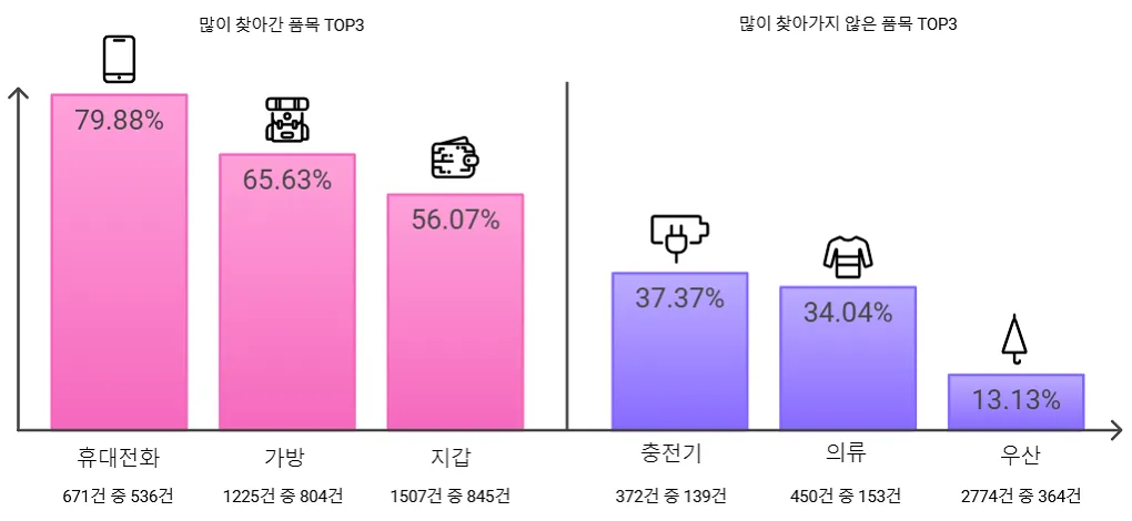 6일 SRT 운영사인 SR에 따르면 지난해 접수된 유실물은 총 1만 2956건으로 이중 48%(6254건)가 주인에게 인도됐다. 인도율이 높은 품목 중 휴대전화는 671건 중 80%인 536건을 찾아갔다. 가방(65%), 지갑(56%) 등 상대적으로 고가 귀중품은 분실자의 적극적인 문의와 인도받기 위한 행동이 빠른 것으로 분석됐다. 반면 우산(13%)과 의류(34%), 충전기·보조 배터리(37%) 등은 인도율이 떨어졌다.