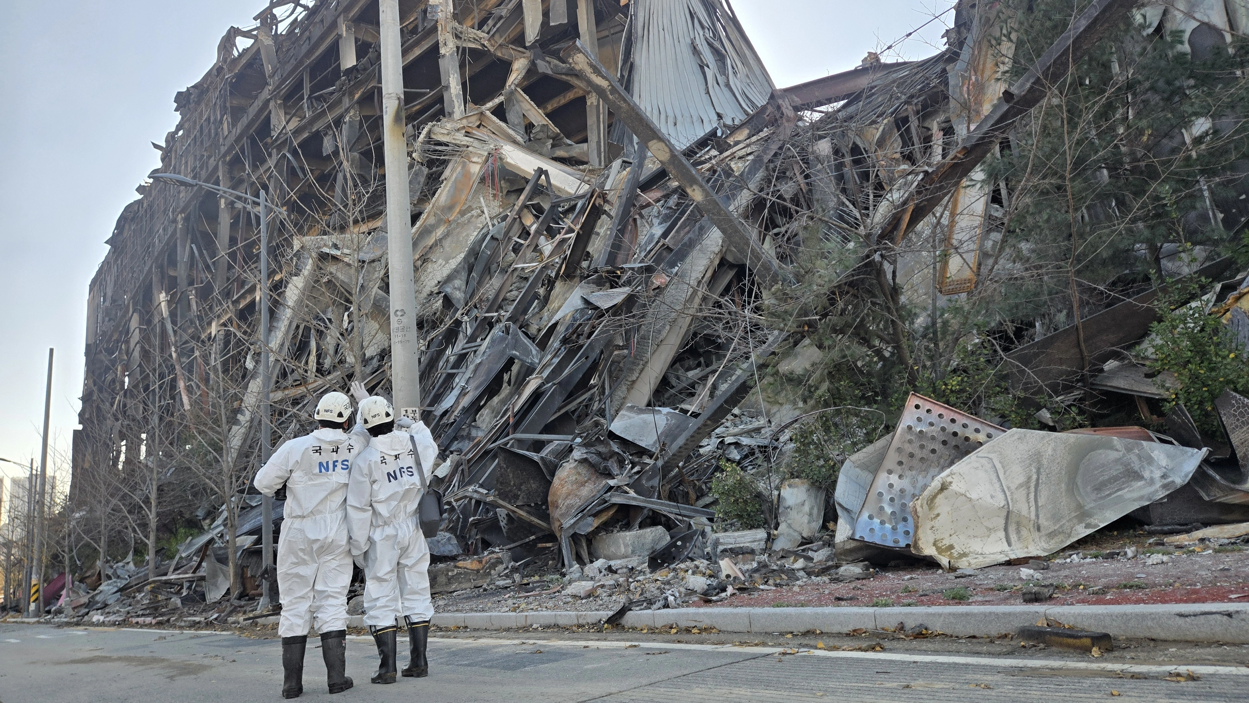 21일 충남 천안시 이랜드패션 물류센터 화재 현장에서 합동감식 참여자들이 무너진 물류센터를 확인하고 있다. 서울신문DB