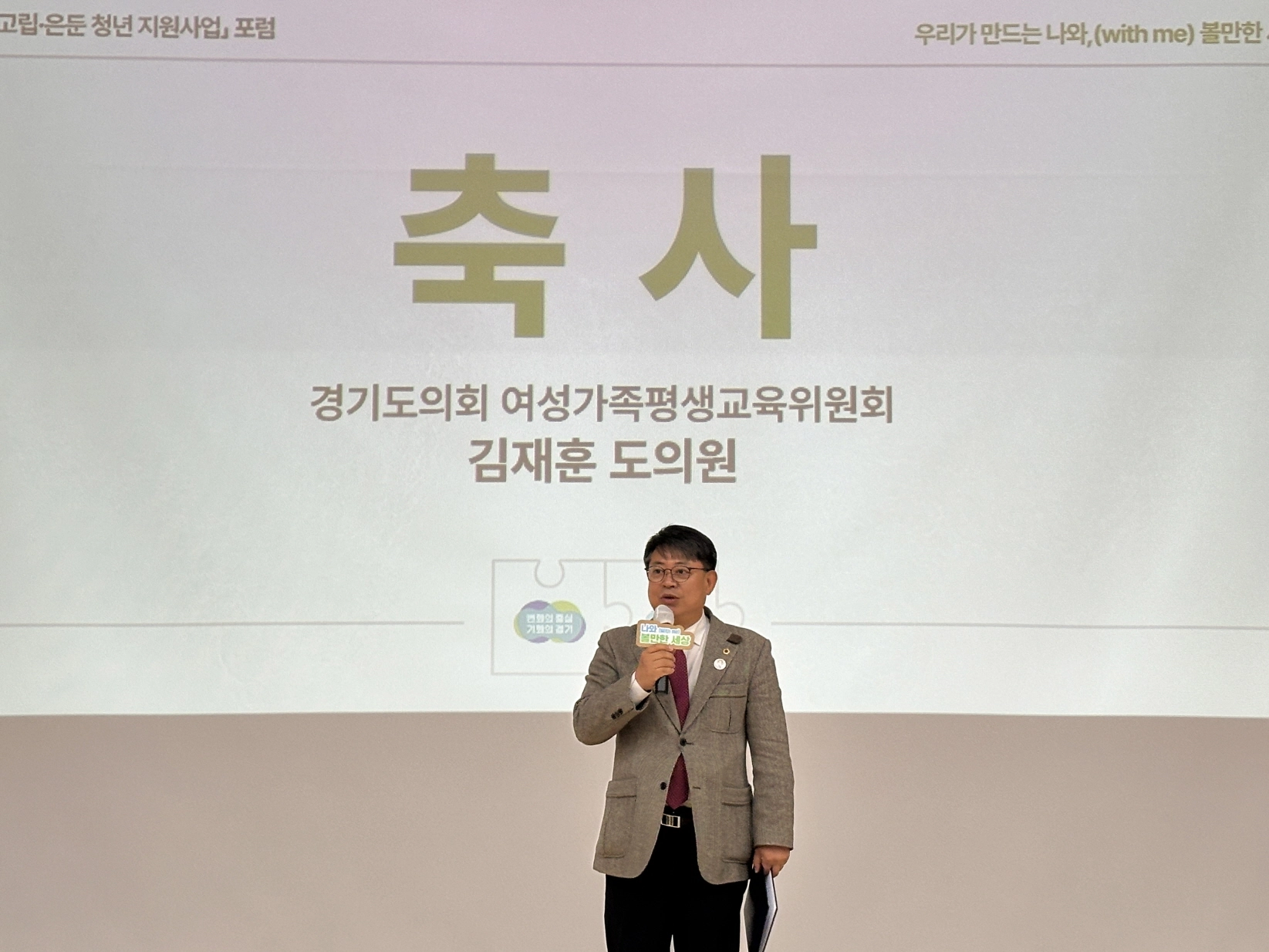 경기도의회 여성가족평생교육위원회 김재훈 의원(국민의힘, 안양4)은 18일(화) 수원유스호스텔 스타트홀에서 열린 ‘2025년 경기 고립·은둔 청년 지원사업 포럼 – 우리가 만드는 나와(with me), 볼만한 세상’에 참석했다.