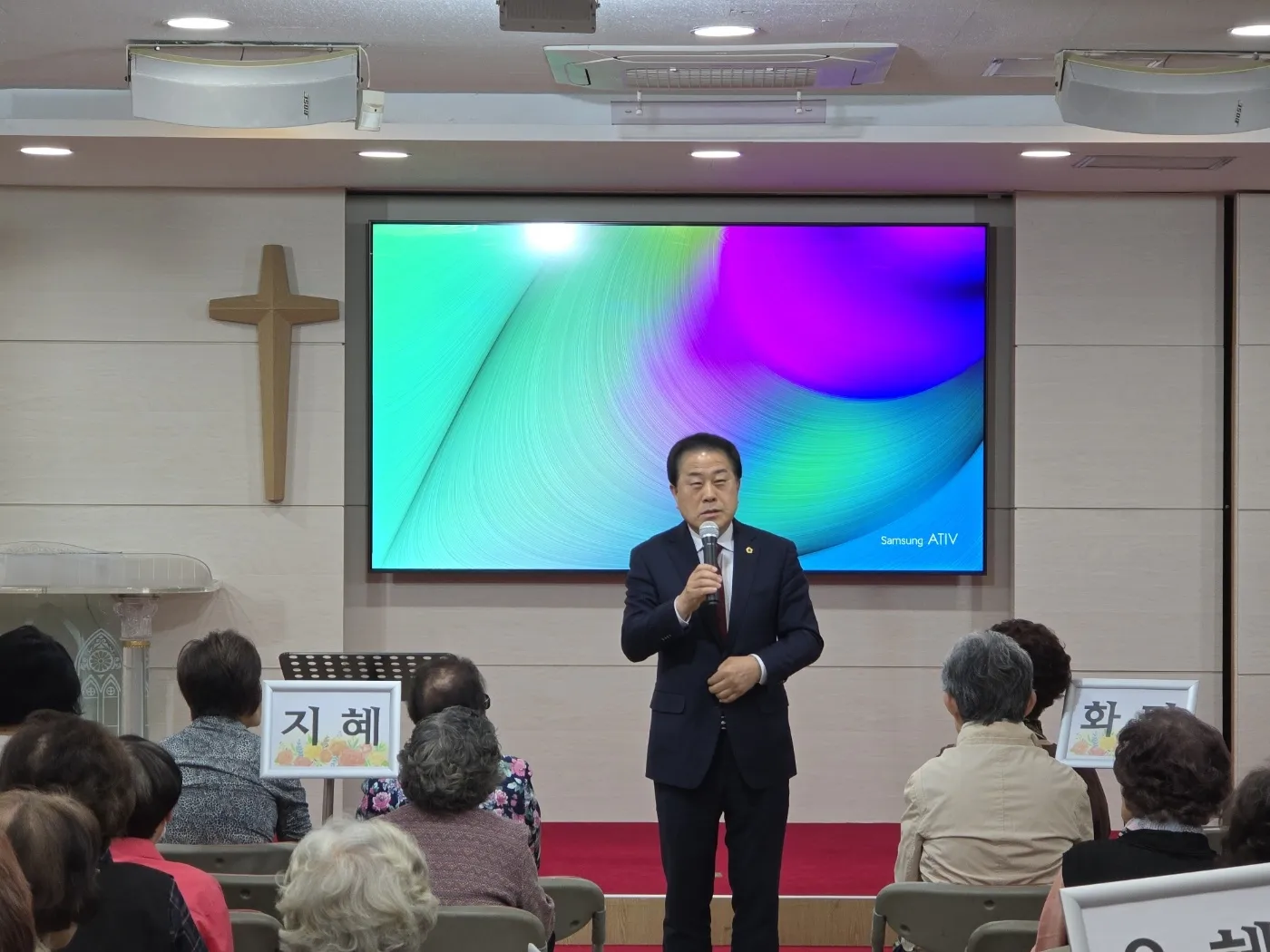 지난 15일 용산구 충신교회 건강교실에서 열린 프로그램에 참석한 김용호 의원이 인사말을 하고 있다.