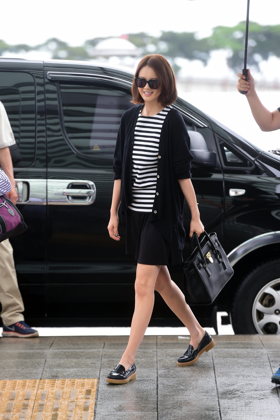 이날 그녀는 루즈한 스타일의 블랙 가디건과 블랙 앤 화이트의 스트라이프 티셔츠를 입고, 여기에 블랙 미니 스커트를 입어 전체적으로 편안해 보이면서도 스타일리시한 매력을 발산했다.