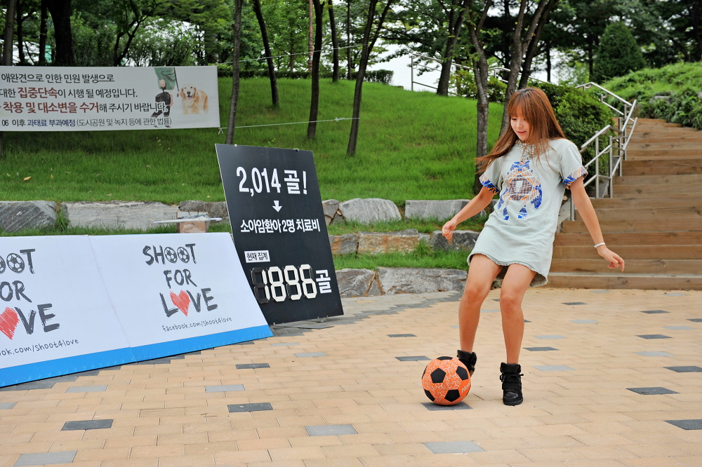 지난 4월부터 시작된 ‘슛포러브’는 도심 한복판에 설치된 게릴라 축구장에서 시민들이 한 골을 성공시킬 때마다 5천원이 소아암 환아의 치료비로 기부되며, 1,000골이 모이면 소아암 환아 1명의 생명을 구할 수 있다는 취지의 캠페인이다.