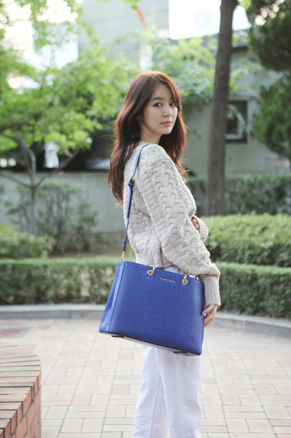스타일 포인트로는 본인이 뮤즈로 활동하고 있는 사만사 타바사의 크로코 소피아 블루 백을 착용해 부드러우면서도 세련된 캐주얼 룩을 완성했다.