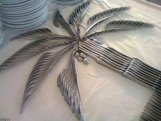 공개된 사진에는 포크와 나이프, 티스푼을 이용해 만든 야자수 형상이 있다. 야자수는 포크의 크기를 다르게 해 다양한 잎 크기를 연출했고, 티스푼으로 야자수 열매까지 표현해 네티즌들은 놀라게 했다.