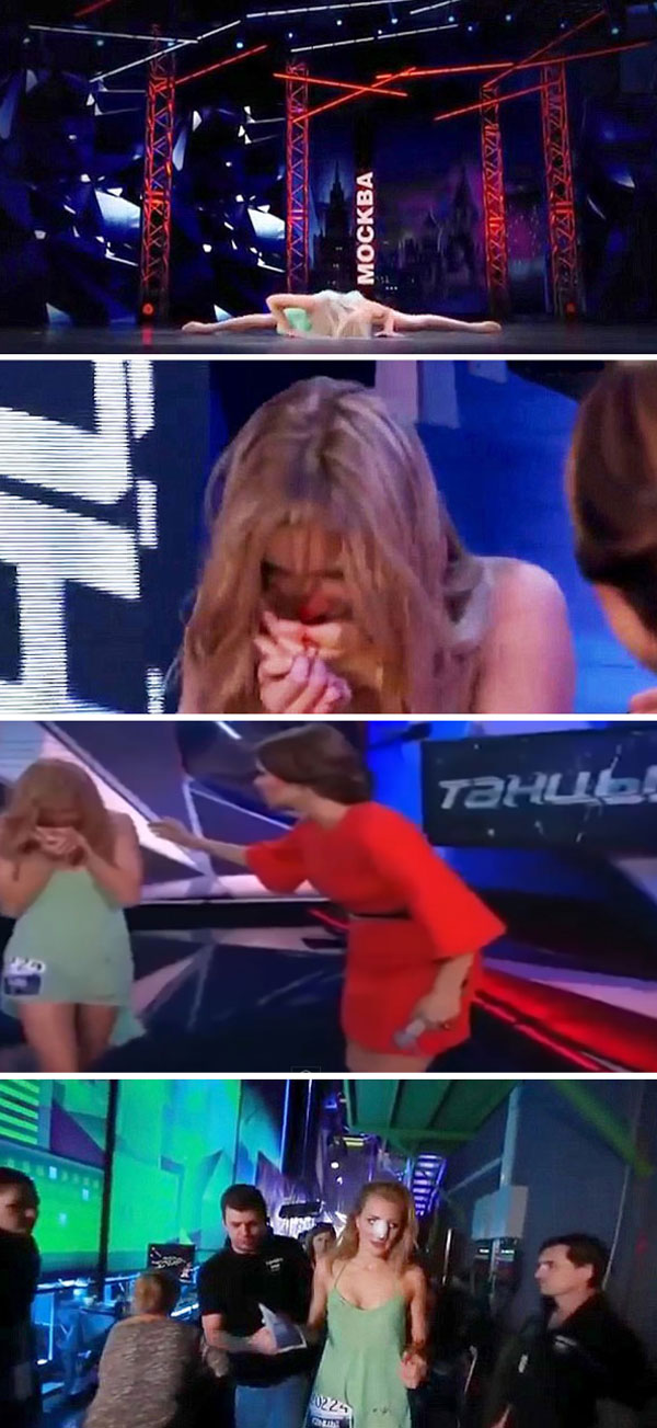 생중계된 영상에는 러시아 최고의 댄서를 찾는 ‘댄싱’ 오디션에 참가한 그녀가 민트색 드레스를 입고 맨발로 무대에 올라 화려한 현대 무용을 선보인다. 그녀가 일어선 상태로 빠르게 다리를 벌려 상체를 앞으로 숙이는 순간, 그녀의 얼굴이 강하게 땅에 부딪힌다. 콘드라시나는 음악이 끝날 때까지 멋진 춤을 선보인다. 멋진 춤을 선사한 그녀가 얼굴을 감싸쥔 채 급히 무대를 빠져나간다.