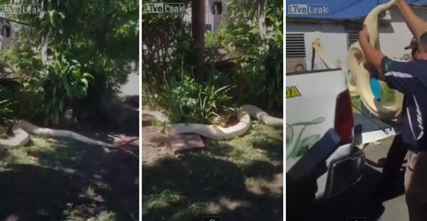 영상에는 주택가 마당 풀숲에 있는 거대한 뱀을 구경하기 위해 몰려든 구경꾼들과 신고를 받고 출동한 동물포획가의 모습이 담겨 있다. 잠시 후, 포획가들이 도구를 이용해 뱀을 풀숲에서 끌어내 트럭에 싣는다.