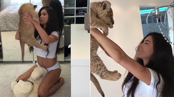 러시아의 한 속옷 모델이 새끼 사자로부터 봉변당하는 영상이 소셜 네트워크상에서 폭발적인 인기를 끌고 있다.