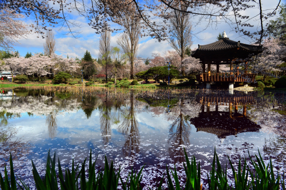 보문호 일대는 호수와 벚꽃이 어우러져 화사한 풍경을 펼쳐 낸다. 벚꽃의 규모, 탐화 인파 등 여러모로 경주 벚꽃의 ‘갑’이다. 여기에 이제 막 움이 돋기 시작하는 수양버들이 연초록빛 추임새로 박자를 맞춘다. 숱한 사람의 발길이 머무는 보문관광단지 안에서도 경주 사람조차 잘 모르는 경승지가 있다. 바로 보문정이다. 수양벚꽃과 왕벚꽃, 그리고 아담한 정자 등이 작은 연못과 더불어 데칼코마니 같은 풍경화를 펼쳐 내는 곳이다. 힐튼 호텔에서 대각선 방향의 버스 정류장 뒤편에 있다. 예전엔 일부 사진작가들만 알음알음 찾던 곳이다. 하지만 휴대전화의 카메라 성능이 일반 카메라에 버금가는 수준에 이른 지금, 장삼이사라도 이 같은 풍경 앞에 서면 능히 작가가 될 터다.