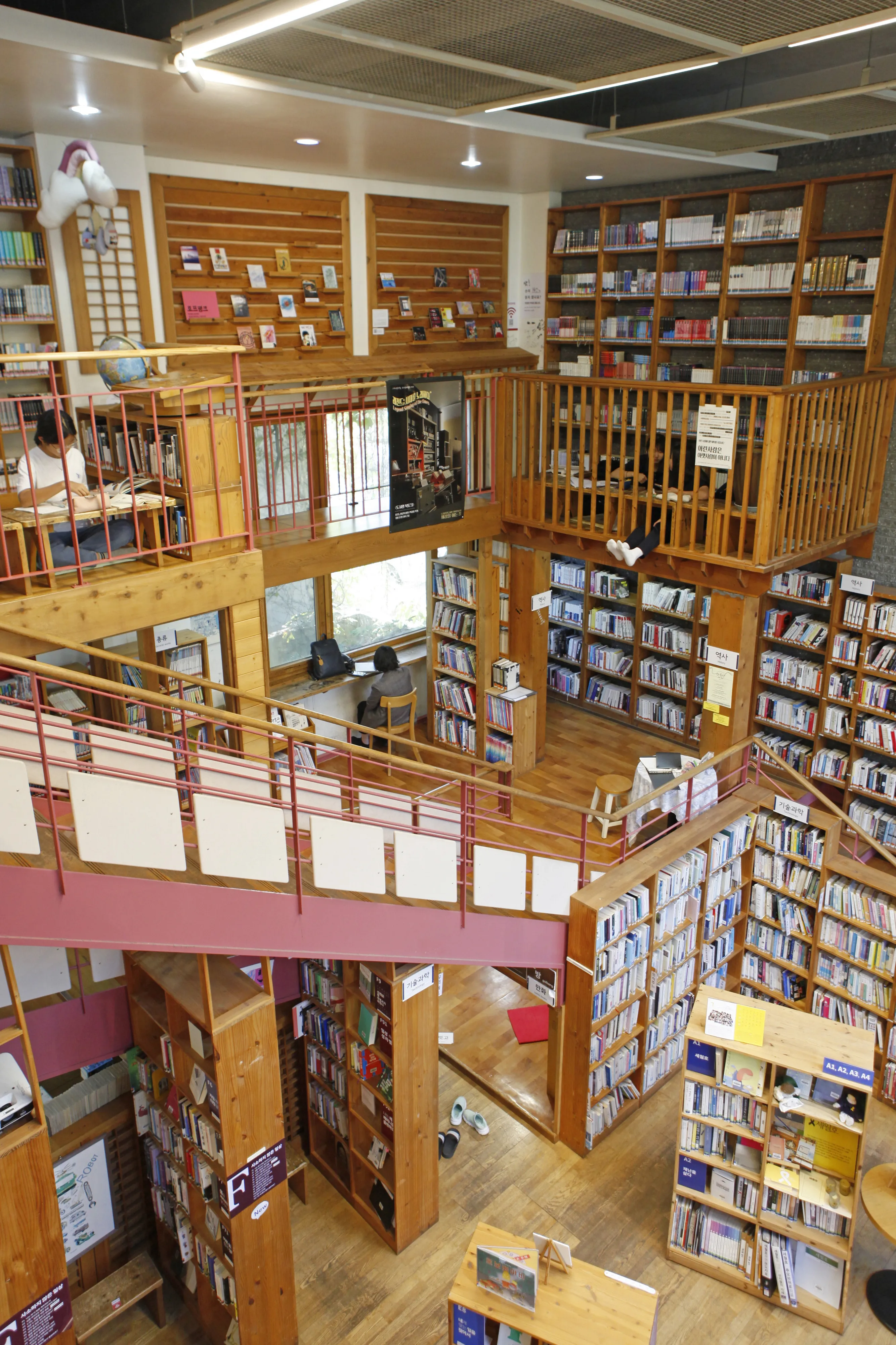 입장에 앞서 외벽에 간판처럼 자리한 설립 취지 글을 읽는다. ‘만남, 소통, 어울림이 있는 마을문화를 꽃피우는 곳’이라는 문구는 느티나무도서관 아래여서 더욱 각별하다. 이제 우리의 도서관은 지역 커뮤니티의 중심으로 자리매김하려 노력 중이다. 느티나무도서관은 이미 20여년 전부터 이 방식으로 존재했다. 공립이 하지 못하는 참신한 시도와 실험을 계속 했고 지속하는 중이다. 그 여정은 도서관이 나아가야 할 미래, 우리가 바라는 도서관의 내일이기도 하다. 그래서 ‘책꽂이 옆에 그네와 다락방도 있는 시끌벅적한 도서관’이 달갑다.
