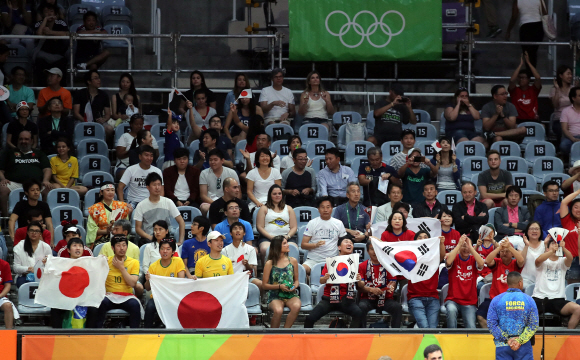 대한민국 응원단과 일본 응원단이 6일 오전(현지시간) 브라질 리우데자네이루 마라카나징유 배구 경기장에서 진행된 2016 리우올림픽 여자배구 조별예선 1차전 대한민국-일본의 경기에서 응원을 하고 있다.
