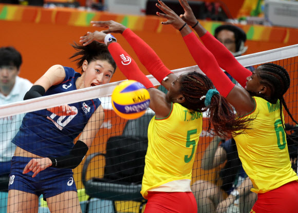 한국은 1세트에서 김연경(터키 페네르바체)을 중심축으로 삼아 센터 양효진(현대건설)·김수지(흥국생명)의 속공, 김희진·박정아(이상 IBK기업은행)의 측면 공격 등 다양한 공격 루트를 가동하며 카메룬의 블로킹을 따돌렸다.