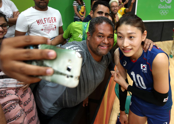 14일(현지시간) 브라질 리우데자네이루 마라카낭지뉴 경기장에서 열린 2016 리우올림픽 여자배구 한국 대 카메룬 경기 직후 대표팀의 김연경 선수가 현지인들과 기념사진을 찍고 있다. 연합뉴스.