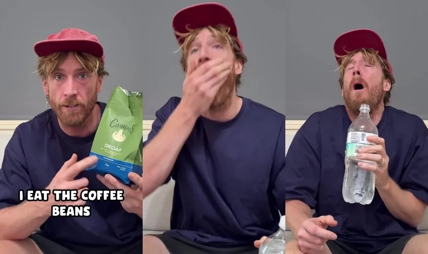 실제 마이클은 커피 생두 한 움큼을 집어 입에 털어 넣고 씹지도 않고 물과 함께 삼켰다. 그는 이 과정을 여러 차례 반복한 뒤 “이제 소화시키자”고 말했다.