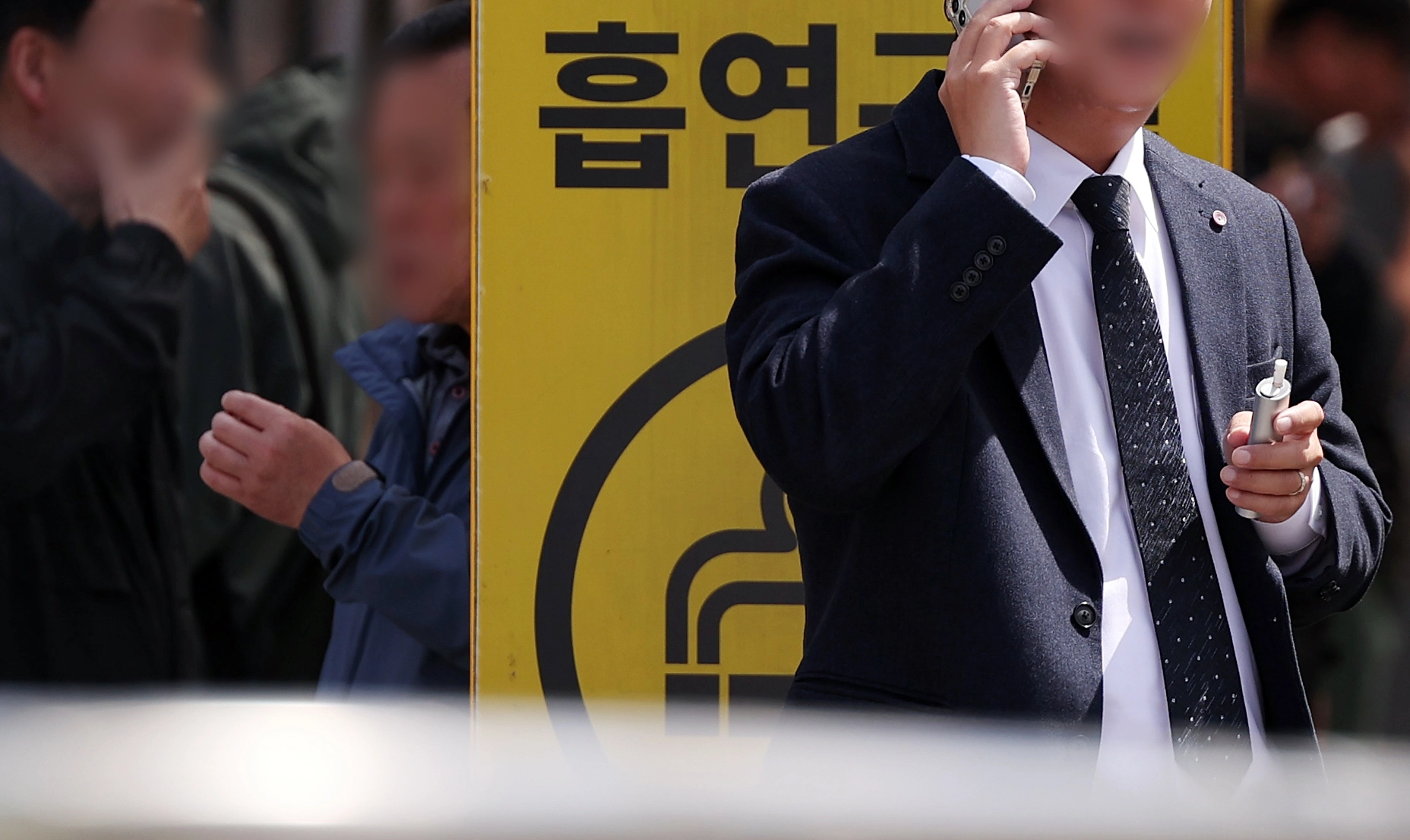 24일부터 합성 니코틴이 포함된 액상형 전자담배는 금연 구역에서 사용이 금지된다. 담뱃갑에는 경고 그림과 문구 등 건강 경고를 표기해야 한다. 흡연자의 경우 금연구역에서 모든 형태의 담배를 피울 수 없게 되고, 이를 어기면 10만원 이하의 과태료가 부과될 수 있다. 사진은 23일 서울 중구 서울역 인근 흡연장소에서 전자 담배를 피는 시민. 2026.4.23 뉴스1