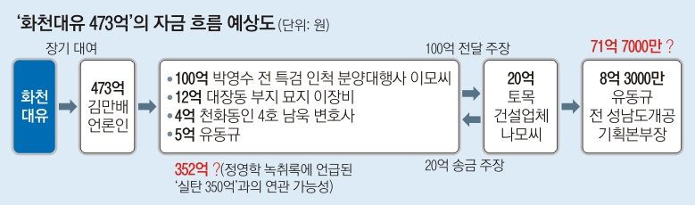 10일 서울신문 취재와 화천대유 및 김씨 측 해명, 검찰 수사 내용 등을 종합하면 김씨가 화천대유에서 빌린 대여금 가운데 353억원의 사용처가 불분명한 상태다. 김씨가 화천대유에서 빌린 자금에서 가장 먼저 용처가 확인된 금액은 박영수 전 특검의 인척인 이모씨의 분양대행사로 흘러들어 간 100억원이다. 이씨는 김씨에게 받은 이 100억원을 토목건설 업체 대표 나모씨에게 모두 전달했다고 주장하고 있지만, 나씨는 이씨에게 20억원만 받았다고 밝히고 있다.