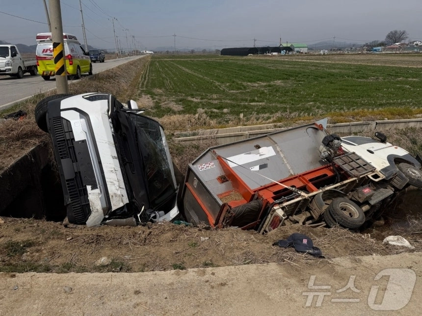 경찰은 두 차량이 신호등 없는 교차로에서 직진하다 충돌한 뒤 농수로로 추락한 것으로 보고 정확한 사고 경위를 조사하고 있다.