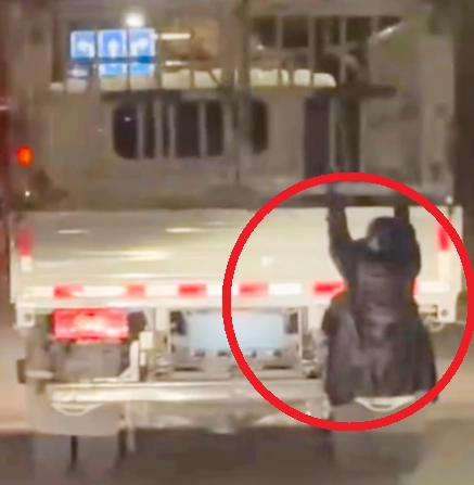 아무런 안전 장비도 갖추지 않은 한 여성이 트럭 뒤에 아슬아슬하게 매달려 있었기 때문이다.